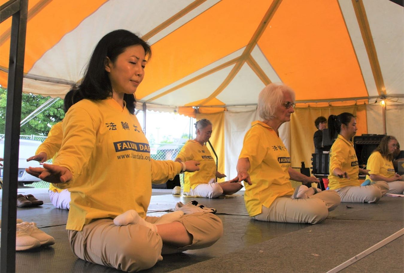 '图8:2018年9月5日,宋女士(左一)和其他法轮功学员应邀参加了特洛伊“国际日”(International Day)帐篷内的功法展示活动'