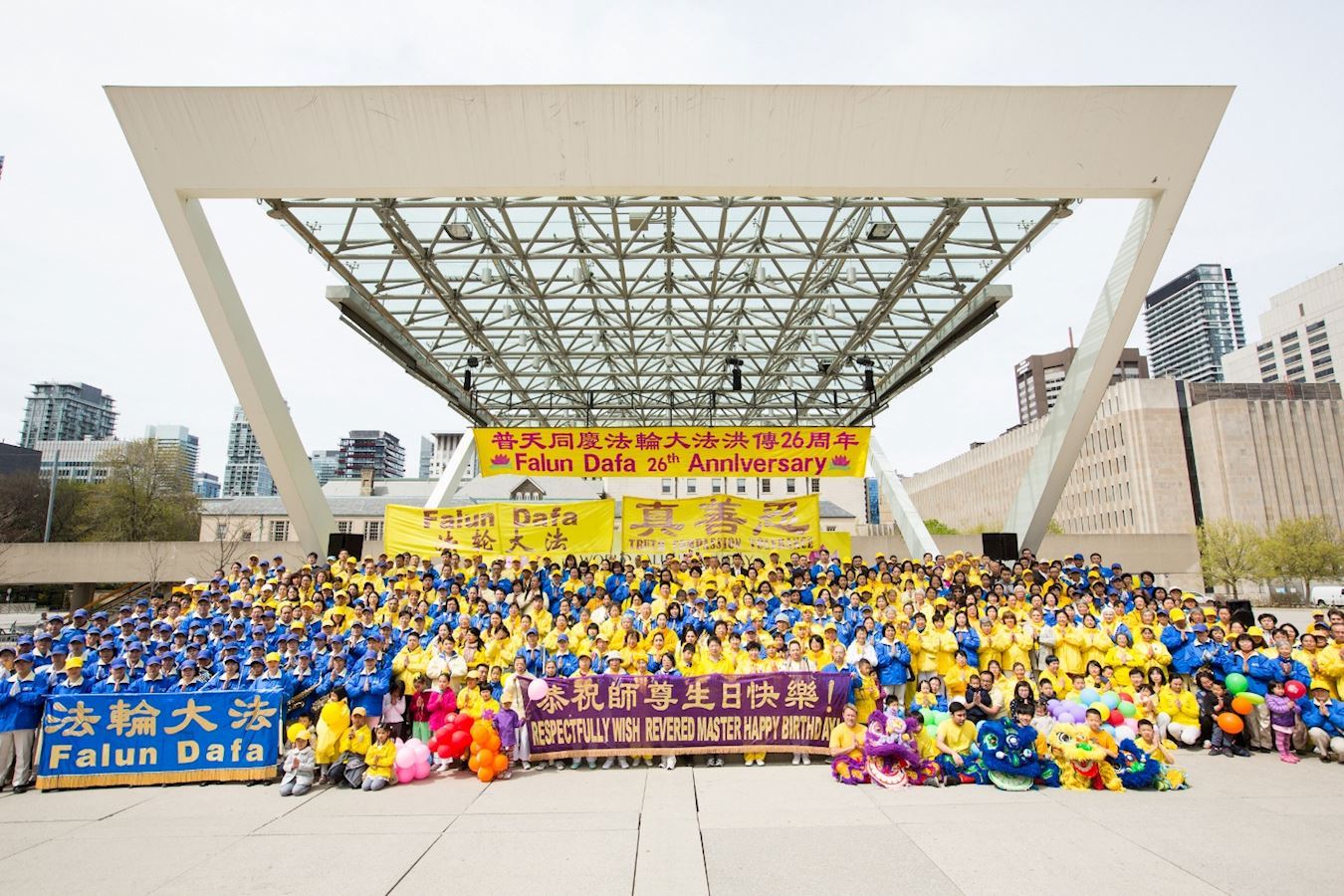 '图3:二零一八年五月,多伦多法轮功学员聚集在多伦多市政厅广场庆祝世界法轮大法日,恭祝师尊生日快乐。'