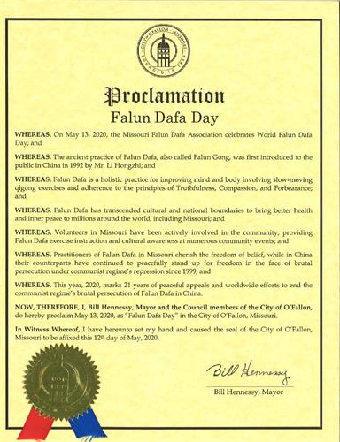 现在,鉴此,我,比尔·汉尼斯,奥法隆市市长和市议会,宣布二零二零年五月十三日为密苏里州奥法隆市的法轮大法日。