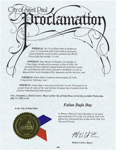 因此,现在,我,圣保罗市市长,麦文·卡特,宣布2020年5月13日,为圣保罗市的法轮大法日。