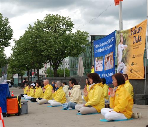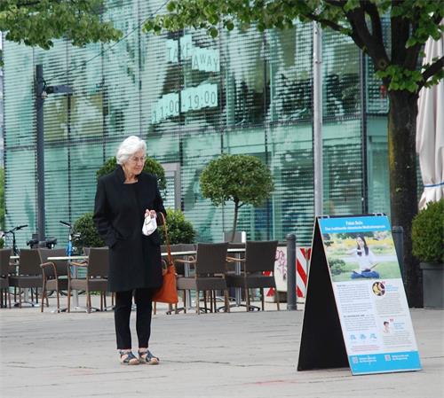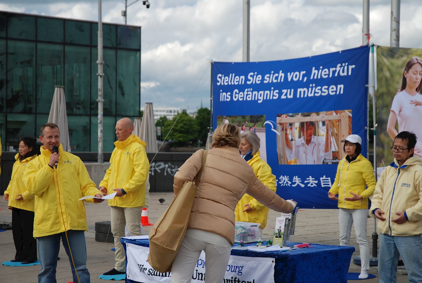 集会上学员在悠扬的乐声中演示功法,穿插着法轮功学员用扬声器向来往行人读公开信,告诉市民法轮大法给人带来健康和希望。不时有市民远远走来,自取法轮功真相传单,有的想知道在哪里可以找到当地学员学炼功法,也有的就是来签名反对中共对法轮功的迫害的。