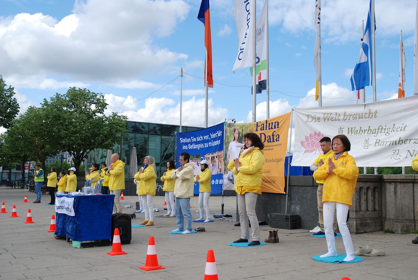 ![]() 图1~3:汉堡法轮功学员在处女堤 (Jungfernstieg)上演示功法。 |