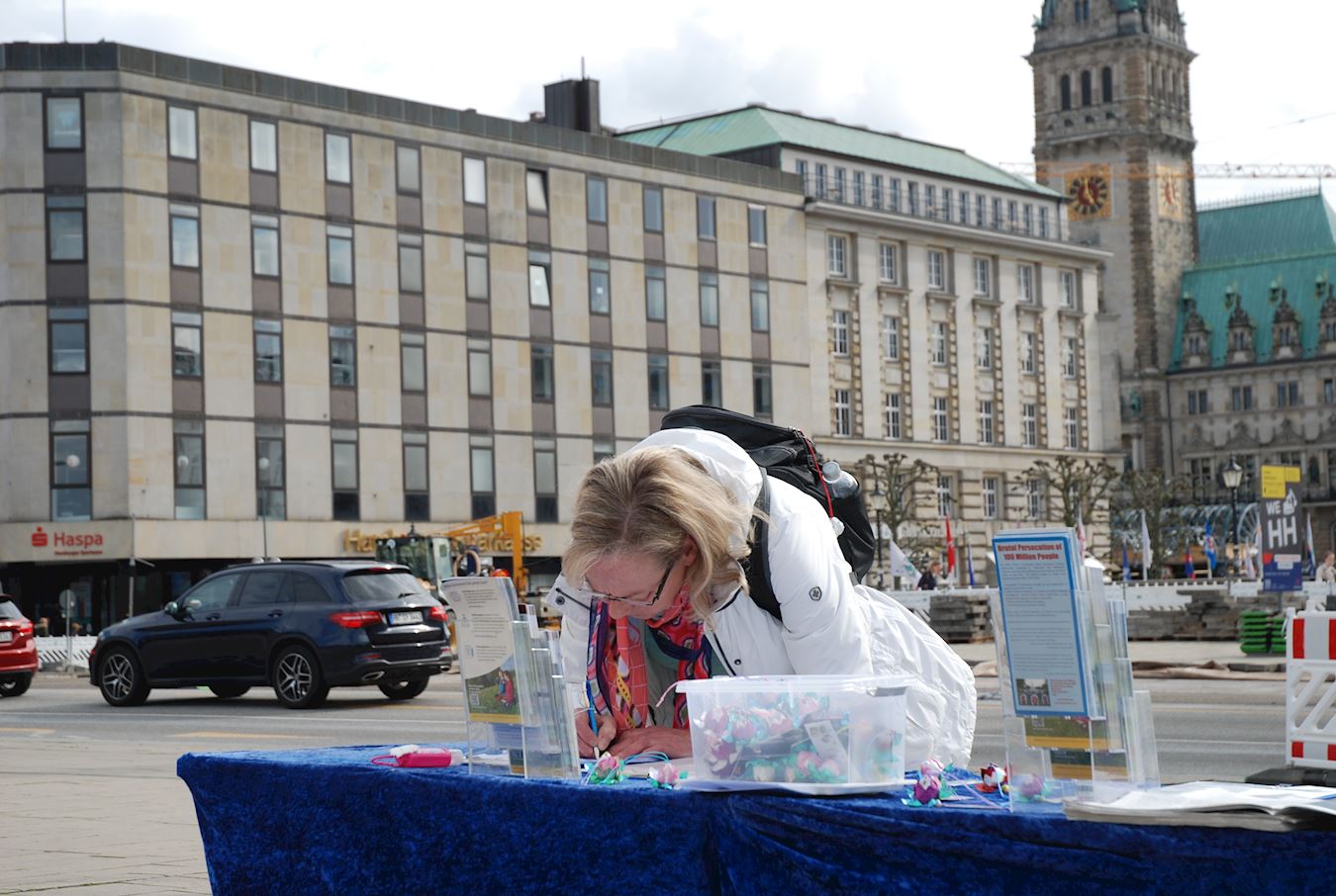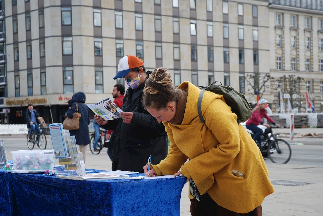 汉堡居民安吉拉(Angela)说:“我浑身起鸡皮疙瘩,太恐怖了。迫害的残酷超过一切正常人的想象。我刚刚签字,是因为我觉得所有的人都有义务,对这样的事件发出反对的声音,共同制止迫害法轮功这个事情。而且我特别觉得应该让更多的民众知道这个事情,应该增加曝光度。民众对这类的事情了解的太少 了,这让我真的心里很难过。”