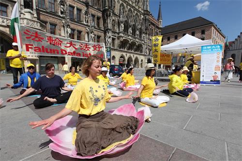 图2:二零一八年五月十三日,伊利斯·林登迈亚(Iris Lindenmaier)在慕尼黑玛琳广场参加庆祝“世界法轮大法日”的活动。