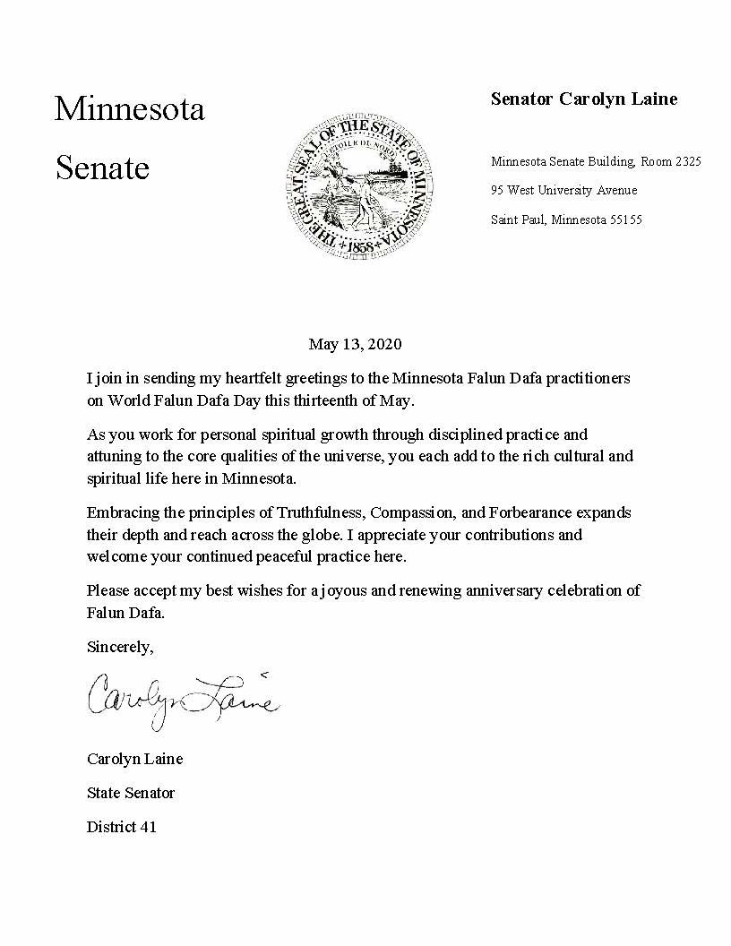 四十一区州参议员卡罗琳·莱恩在褒奖信中赞扬了法轮功学员“丰富了明尼苏达州的文化和精神生活。”将真善忍的“深度和影响力扩展到全球”