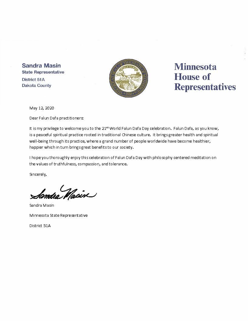 【明慧网二零二零年五月十五日】二零二零年五月,法轮大法弘传世界二十八周年之际,美国明尼苏达州多位政界、学术界人士及民众,纷纷发来贺信或邮件,共同表达对法轮大法的创始人的敬意,庆祝五月十三日世界法轮大法日,呼吁尽快结束中共对法轮大法的残酷迫害