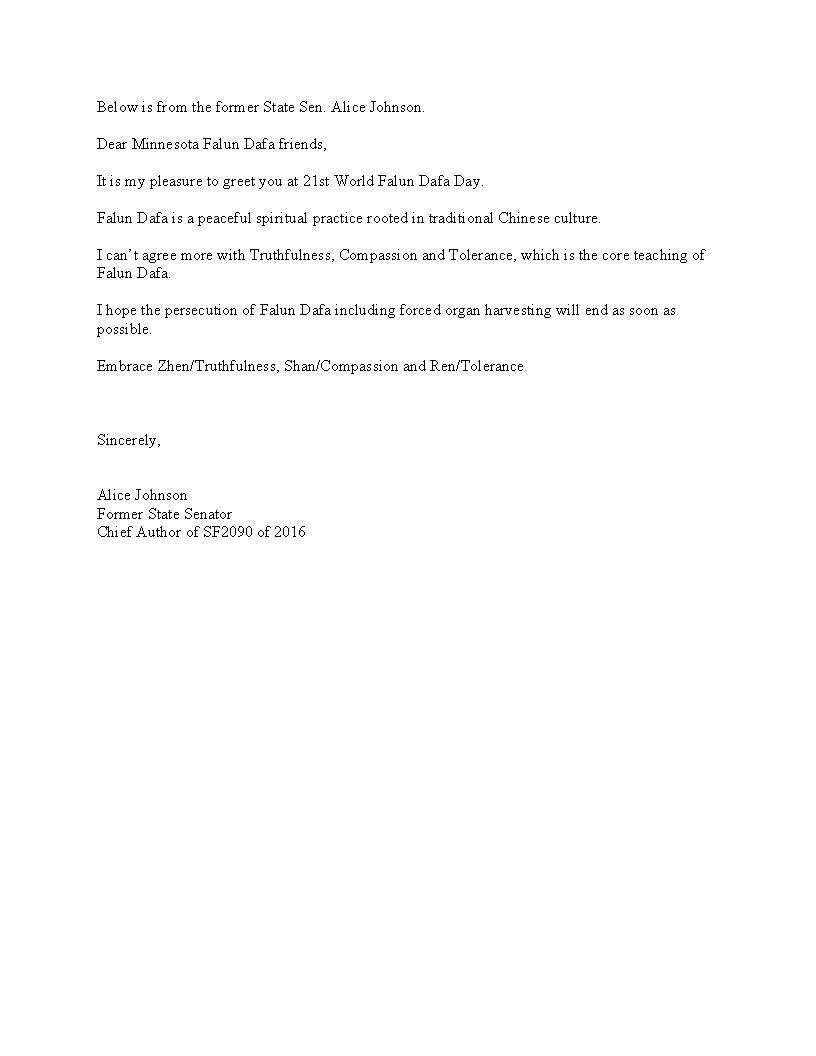 祝贺信来自前明尼苏达州参议员爱丽丝·约翰逊(Alice Johnson)。