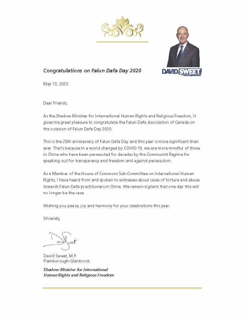 国际人权与宗教自由部门影子部长、国会议员大卫·斯威特(David Sweet)来贺信祝贺2020年法轮大法日。写道:“亲爱的朋友们,作为国际人权与宗教自由部门影子部长,我非常荣幸地向加拿大法轮大法协会恭祝 2020年法轮大法日。今年的法轮大法 28周年纪念日比以往更加重要。因为世界因COVID-19疫情改变之际,我们更要关注那些在中国为正义、自由和反迫害大声疾呼而受共产党政权迫害数十年的人。