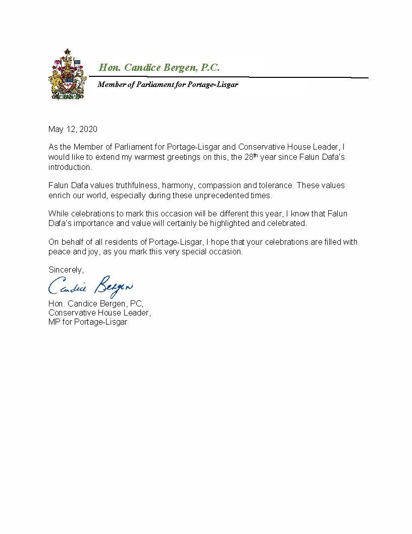 国会议员和保守党众议院议长坎迪斯·卑尔根(Hon. Candice Bergen)在贺信写道:作为Portage-Lisgar地区的国会议员和保守党众议院议长,我在此向法轮大法弘传世界28周年致以最热烈的祝贺。法轮大法重视真诚、和谐、善良和宽容。这些价值观丰富了我们的世界,尤其在这史无前例的特殊时期。虽然今年的庆祝活动会有所不同,但我知道法轮大法的重要性和价值肯定会得到推崇和赞扬。