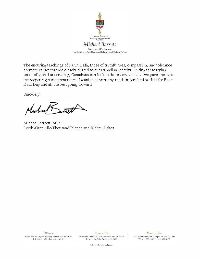 千岛湖和里多湖地区的国会议员迈克尔·巴雷特(Michael Barrett)在贺信里说,法轮大法长久以来弘扬的真、善、忍普世价值和我们加拿大人所秉持的价值观紧密相关。在目前全球寻求各种方式阻止疫情蔓延的动荡时期,加拿大人可以遵循这些原则, 考虑重新开放我们的社区。在法轮大法日到来之际,送上我最真诚的祝愿,祝一切顺利。