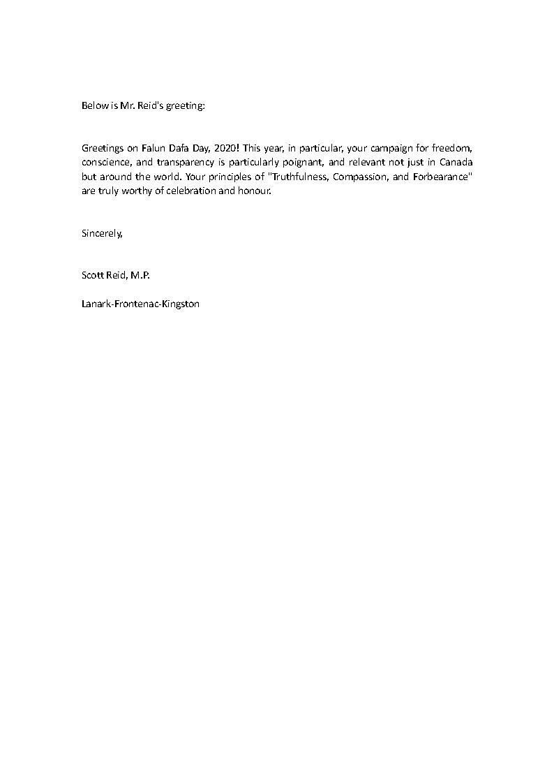 ![]() 图5:国会议员斯科特·里德(Scott Reid)的贺信 |