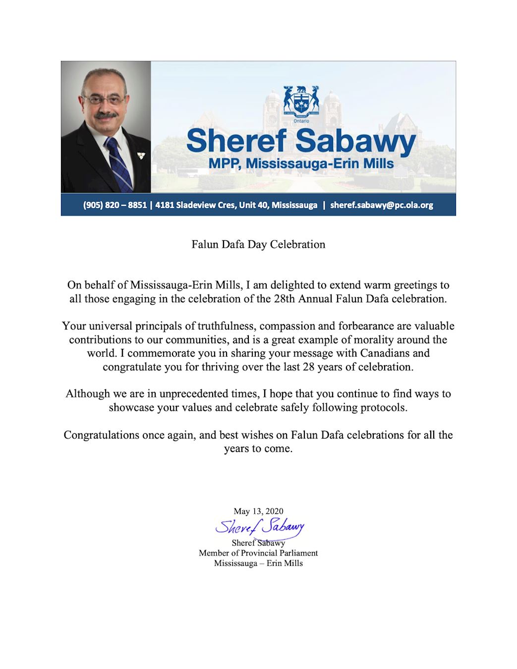 省议员谢里夫·萨巴维(Sheref Sabawy)在贺信里说,你们真、善、忍的普世价值是我们社区非常宝贵的财富,是世界人民应该遵守的道德典范。我鼓励你们和加拿大人分享这些价值观,并祝贺你们28年来的庆贺活动蓬勃发展。尽管我们正处于史无前例的艰难时期,但我希望你们继续用各种方式展示你们的价值观,并以安全、合规的形式举行庆祝活动。