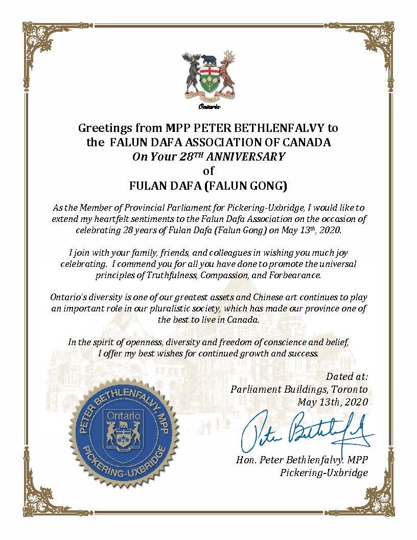 省议员彼得·贝思伦法维(Hon. Peter Bethlenfalvy)在贺信中写道:作为皮克灵-乌克斯布里奇(Pickering-Uxbridge)省议员,我想在此之际,我向法轮大法协会表示衷心的感谢。我与你们的家人、朋友和同事一起庆祝这个欢乐的节日。我赞扬你们为弘扬真、善、忍的普世价值所做的一切。