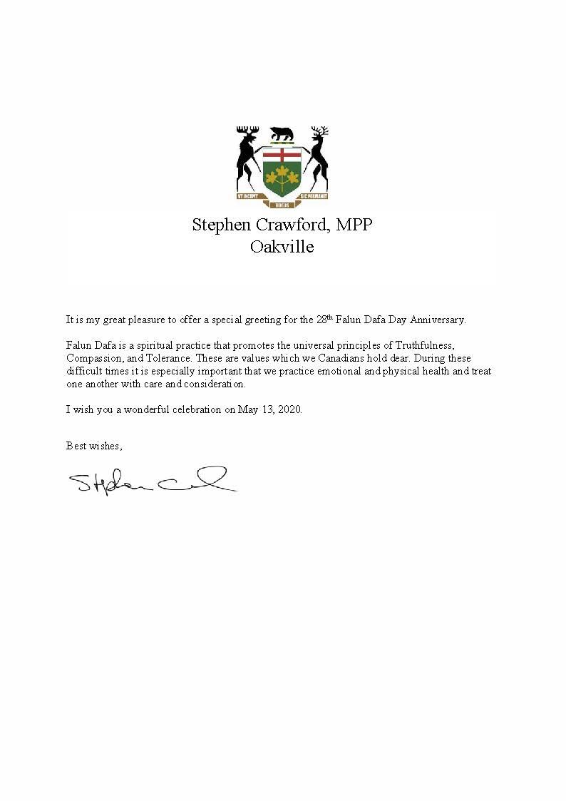 ![]() 图9:奥克维尔(Oakville)省议员斯蒂芬·克劳福德(Stephen Crawford)的贺信 |