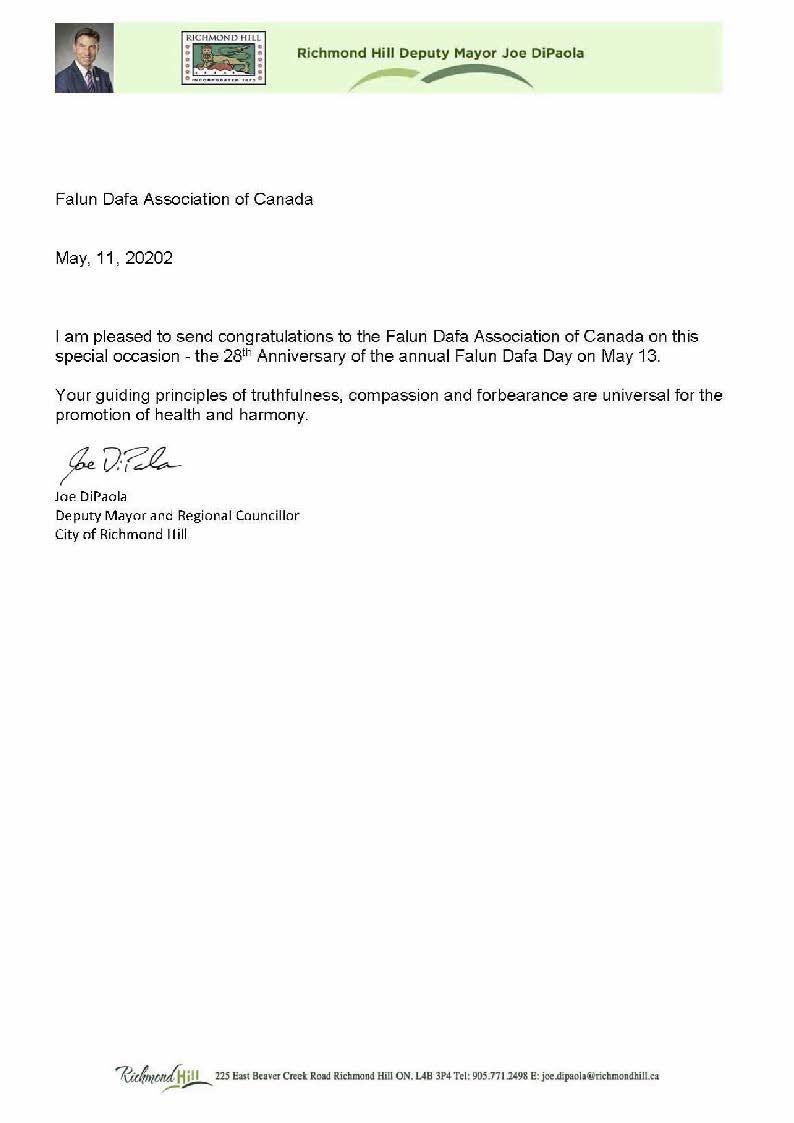 列治文山市副市长和区议员乔·迪帕拉(Joe DiPaola)发来的贺信说,你们所遵循的真善忍的普世原则也能提升我们大家的健康和和谐。