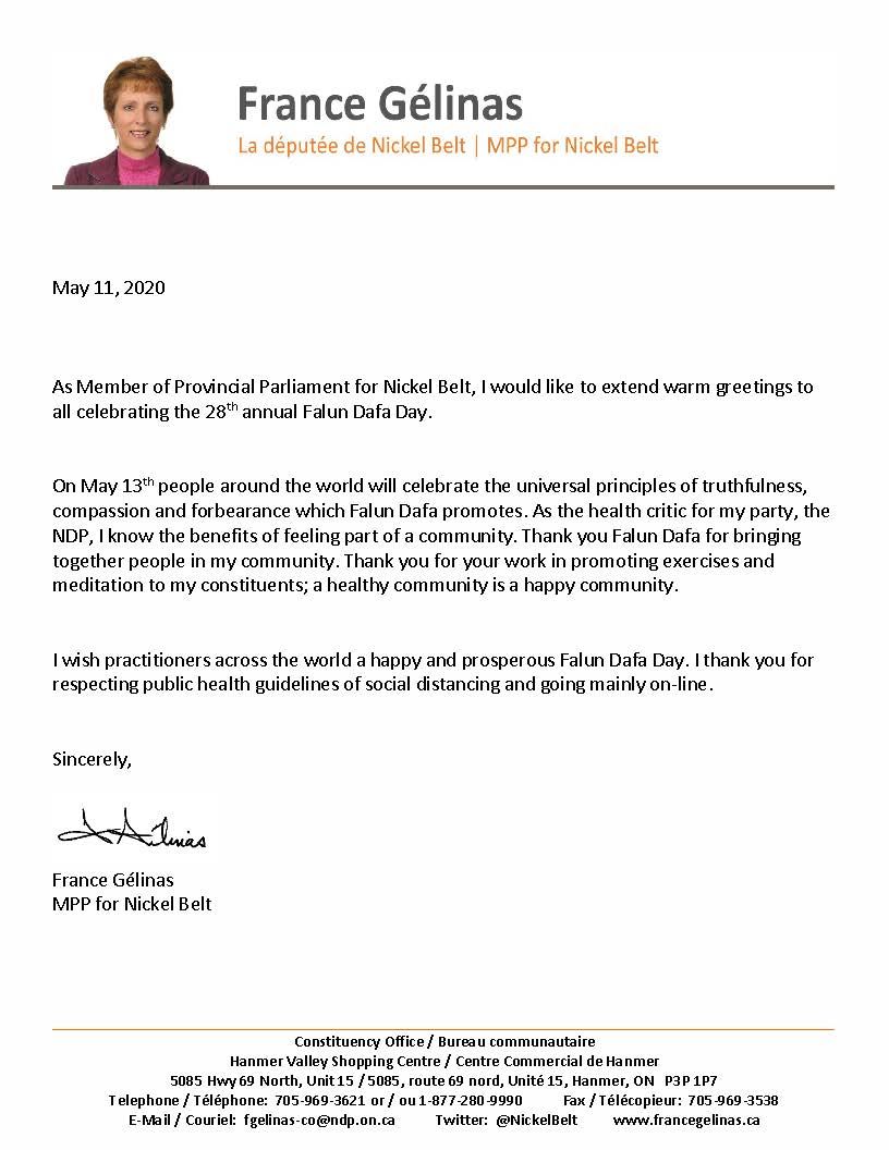 安省新民主党资深省议员、卫生事务评论员姬莲娜丝(France Gélinas)在贺信里说,我是NDP 新民主党健康问题的议员专员,我深知融入社区对国民带来的益处。感谢大家向我们的选民推广健身功法和修心打坐。一个健康的社区才是一个幸福的社区。我祝愿全世界的法轮大法学员度过一个快乐、兴旺的法轮大法日。 感谢你们尊重国家公共健康指导,保持社交距离,用网络来组织庆祝。