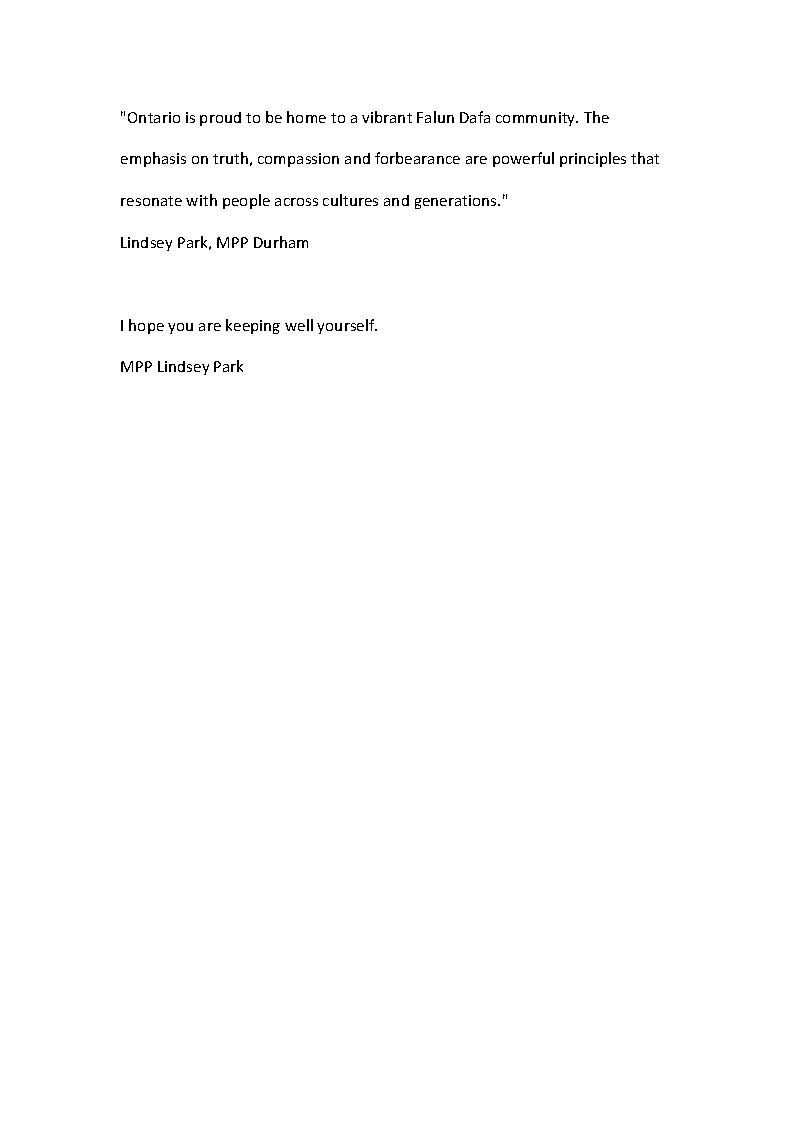 杜林区(Durham)省议员林赛·帕克(Lindsey Park)通过邮件的贺信写道:安大略省为充满活力的法轮大法民众提供安居之所而倍感自豪。强有力的真、善、忍原则是不同文化和不同年龄人们的共识。