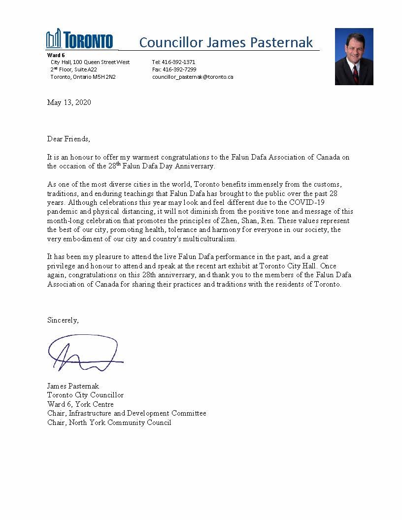 ![]() 图14:多伦多约克中心市议员詹姆斯·帕斯特纳克(James Pasternak)的贺信 |
