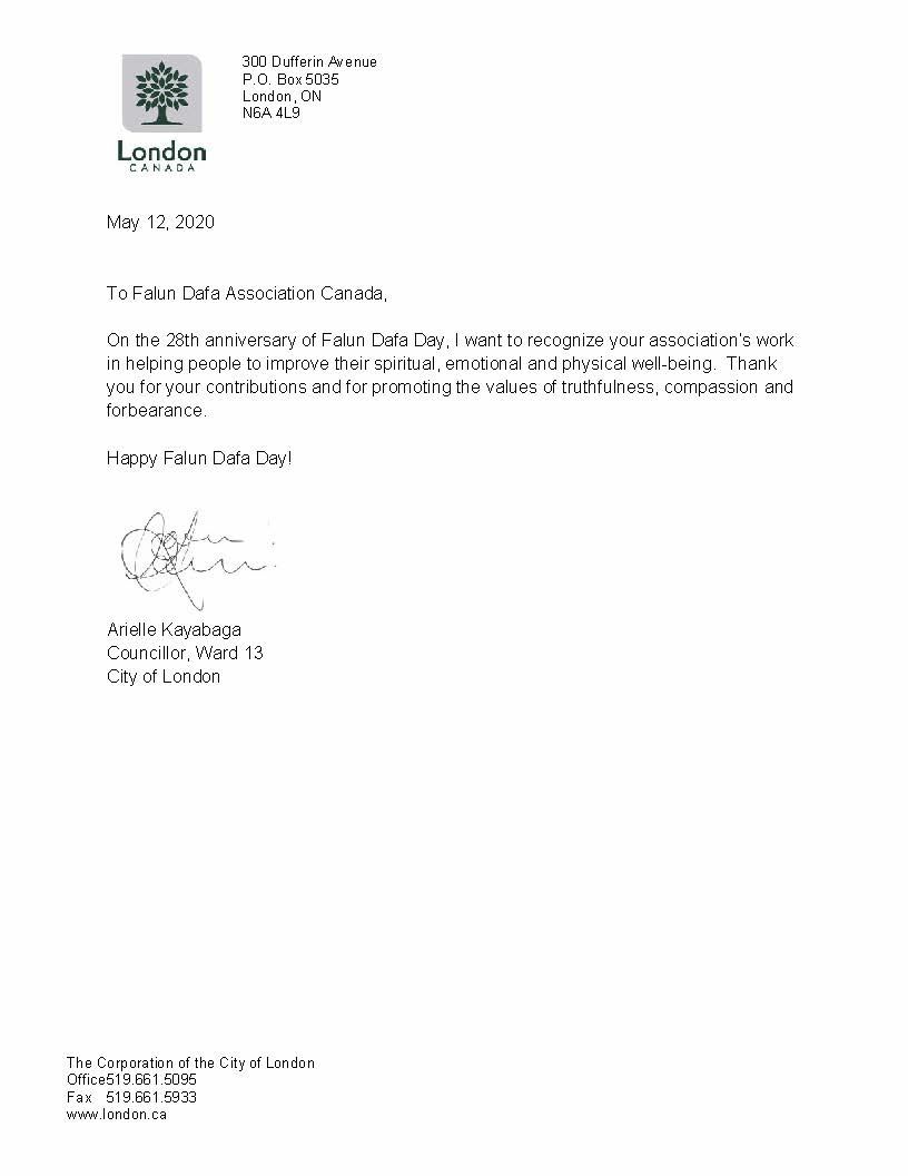 伦敦市议员里耶(Arielle Kayabaga)的贺信中说,你们帮助民众提高了精神品质、心理和身体健康。感谢你们作出的贡献并弘扬真、善、忍普世价值!