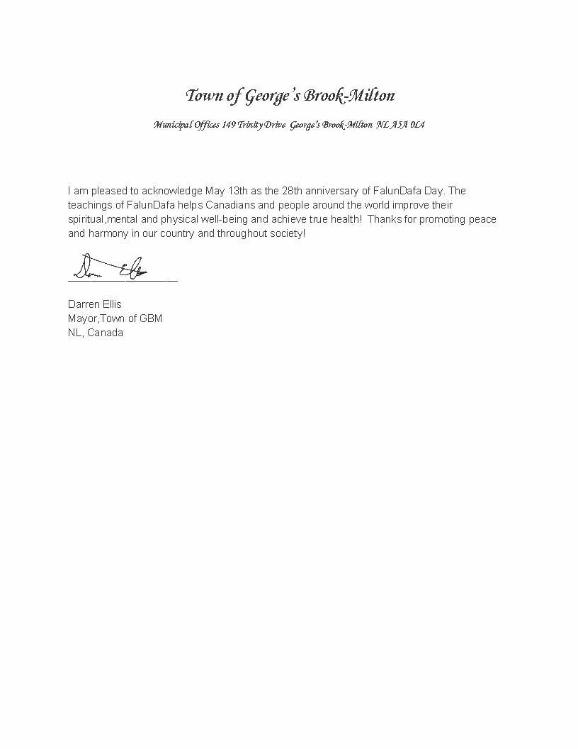 纽芬兰省乔治·布鲁克-米尔顿市市长达伦·埃利斯(Darren Ellis)的贺信写道:法轮大法的弘传帮助加拿大和世界各地的人们提升了他们的精神意识、心理和身体素质,并拥有真正的健康!感谢你们为我们国家及整个社会带来祥和与安康!