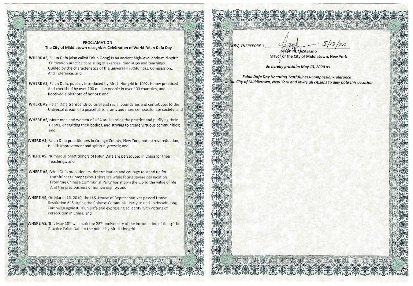 纽约州米德尔敦市(City of Middletown)市长约瑟夫·德斯特法诺(Joseph M. DeStefano)宣告二零二零年五月十三日为纽约州米德尔敦市法轮大法日,颂扬真-善-忍,并相邀所有市民关注此盛事。