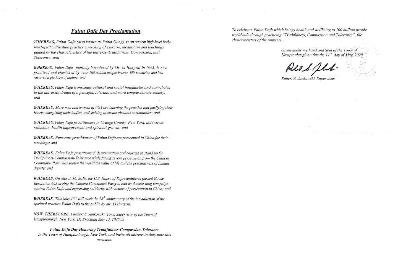 纽约州汉普顿堡镇(Hamptonburgh)镇长罗伯特·扬科夫斯基(Robert S Jankowski)宣告二零二零年五月十三日为纽约州普顿堡镇法轮大法日,并相邀所有市民届时关注此盛事, 庆贺法轮大法给全世界上亿人民通过实践真、善、忍宇宙特性所带来的健康和福份。