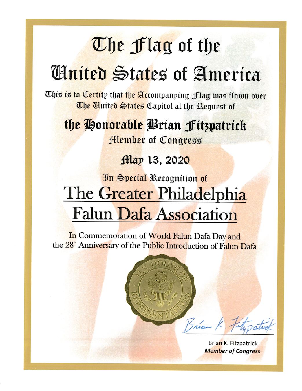 菲茨帕特里克议员在颁发给大费城法轮大法学会的褒奖令中写道,“兹证明,应国会议员布莱恩·菲茨帕特里克(Brian Fitzpatrick)的要求,这面美国国旗于二零二零年五月十三日在美国国会大厦上空飘扬过,以特别表彰大费城法轮大法学会,纪念世界法轮大法日和法轮大法弘传二十八周年。”