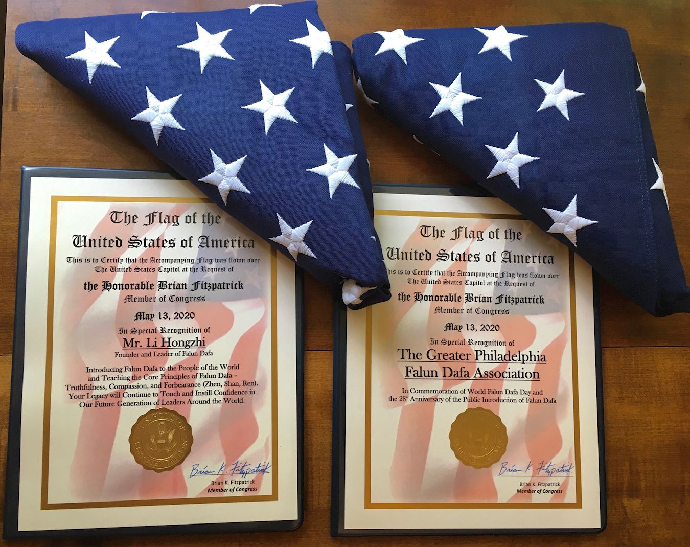 今年五月十三日是“第二十一届世界法轮大法日”,大法弘传二十八周年,暨大法李洪志师父六十九华诞。现年四十六岁的菲茨帕特里克是代表美国宾夕法尼亚州第一国会选区的共和党众议员。他将“5.13”在美国山飘扬过的这两面美国国旗赠予了大费城地区的法轮大法学会。