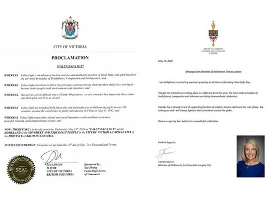 继加拿大西部的3位国会议员和7位市长发来贺信和褒奖之后,加拿大卑诗省首府维多利亚市长和温哥华地区国会议员塔玛拉·詹森也发来褒奖与贺信。