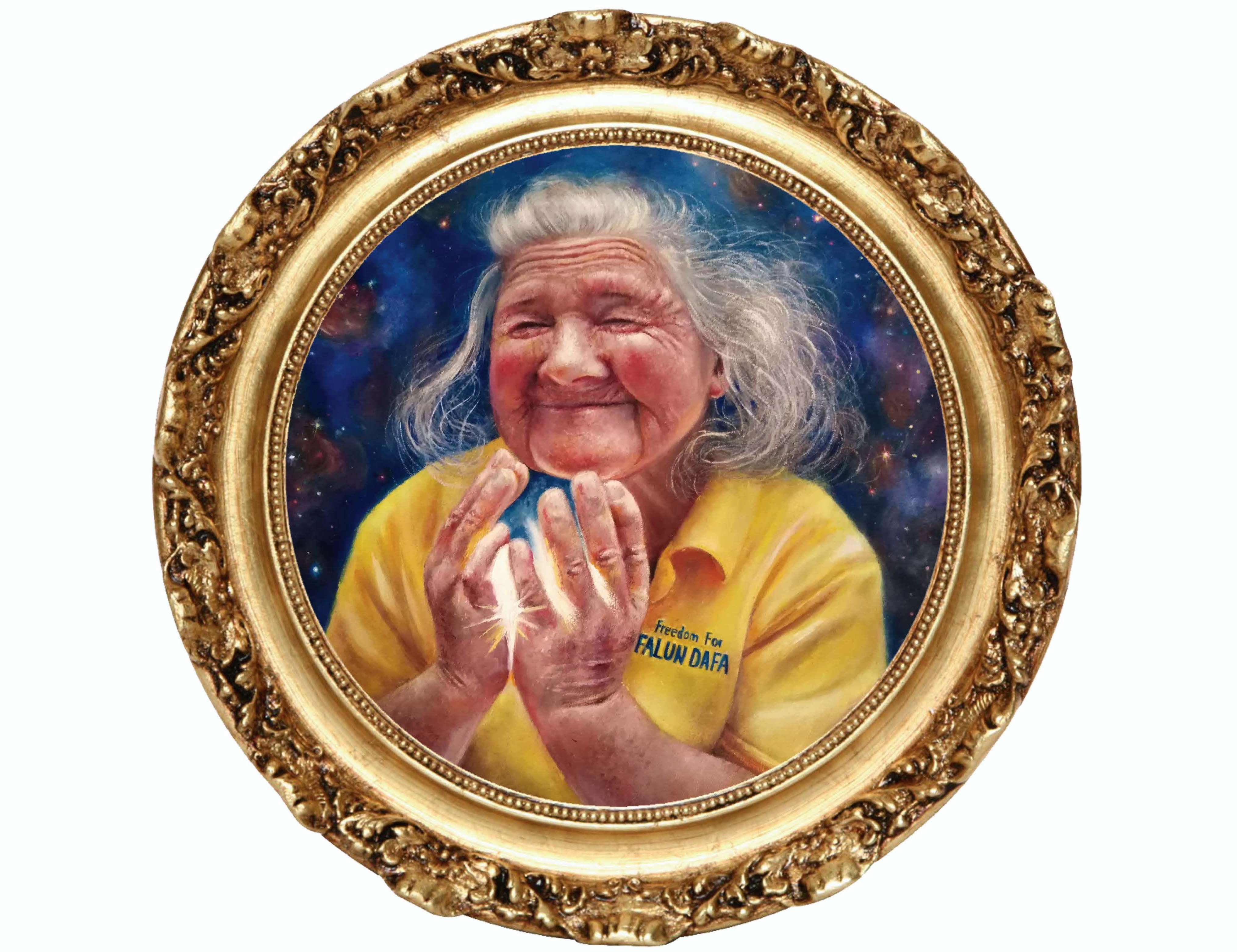 这幅油画的灵感来自于我看到的一幅画面:一位上了年纪的老太太参与一次抗议中共迫害法轮功的和平请愿。我能感受到她的真诚和慈悲。通过这幅画,我希望能表达修炼法轮大法福益身心,也希望更多的人能够在普世原则真善忍的指导中受益。