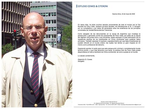 阿根廷起诉江泽民一案的原告律师亚历杭德罗·考斯恭贺法轮功创始人李洪志先生华诞暨法轮大法洪传世界二十八周年。