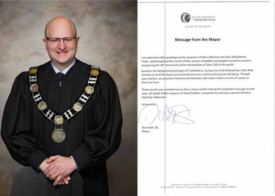 加拿大亚省木水牛自治市市长唐·斯科特发来贺信,褒奖法轮大法,并感谢法轮功学员为传播真善忍价值观所做的努力。