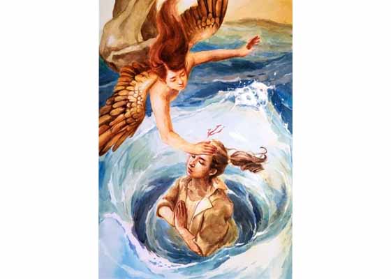 画意:退党后,神抹除了额头的印记,周围的水寓意未来将要遭遇的灾难,被一并化解 。