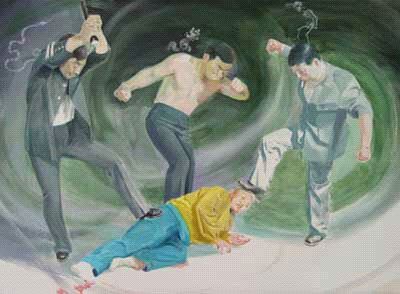 从禁闭室出来还不到一个星期,由于张良喊“天灭共产党,三退保平安”。被监狱李副政委旁边的两个警察拿一根钢绳勒张良的脖子,两人一人拉一边,后来又被警察拽到办公室,一人踹一边,把张良踢跪在地上,脑门砸在地上,头砸破了,鲜血直流,最后还送到医院缝了两针。再次被拖回禁闭室关押了一个月零两天。
