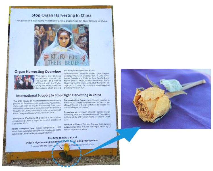 学员们依然保存着上图中的那朵黄玫瑰——这是一位不知名的外国游客在揭露迫害的展板旁默默留下的。黄玫瑰象征着感伤怀念,代表了那位游客了解法轮功学员遭迫害后,表示同情和悲伤的心情。