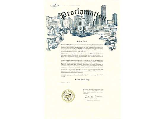 在庆祝法轮大法弘传28周年之际,休士顿市长为此颁发褒奖,赞扬法轮大法给人们带来的福祉,并宣布2020年5月13日为“法轮大法日”。