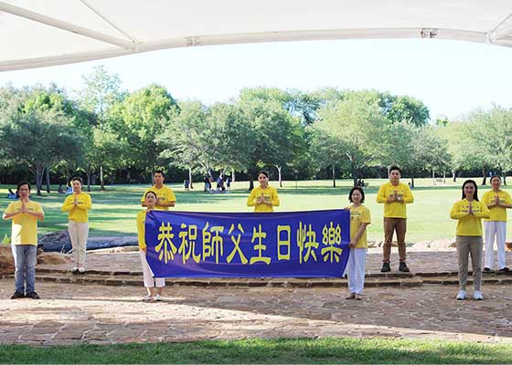 世界法轮大法日即将到来,休斯顿法轮功学员以小组分散在一些炼功点,以弘法、炼功等方式,恭祝李洪志师父生日快乐。