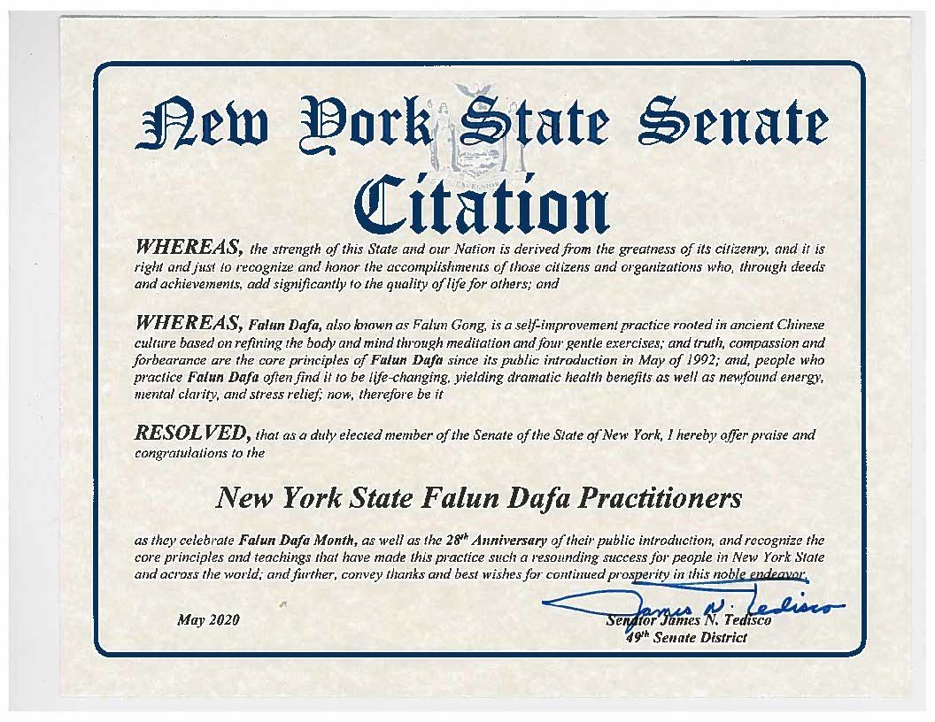 ![]() 纽约州参议员詹姆斯·特迪斯科的褒奖状 |