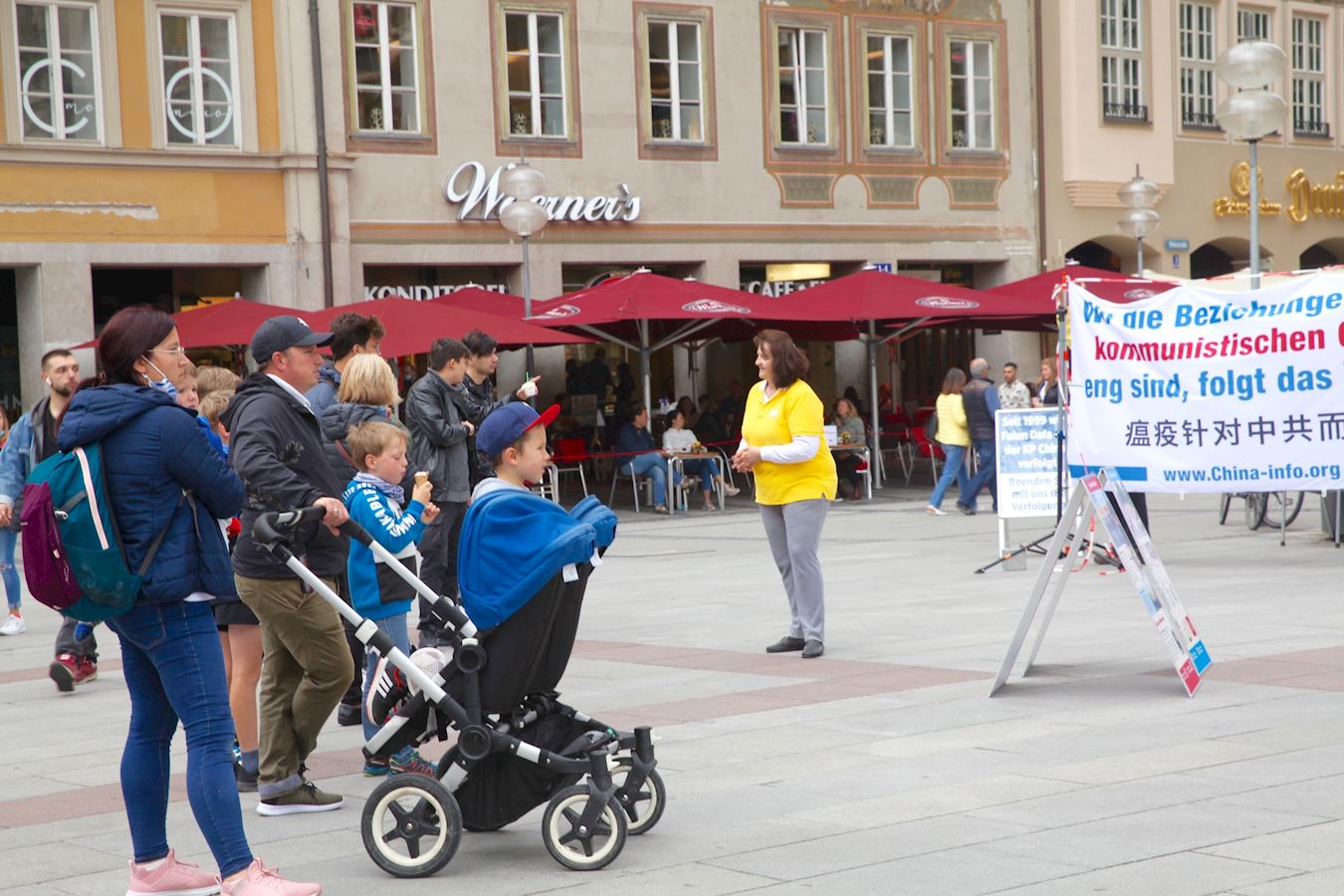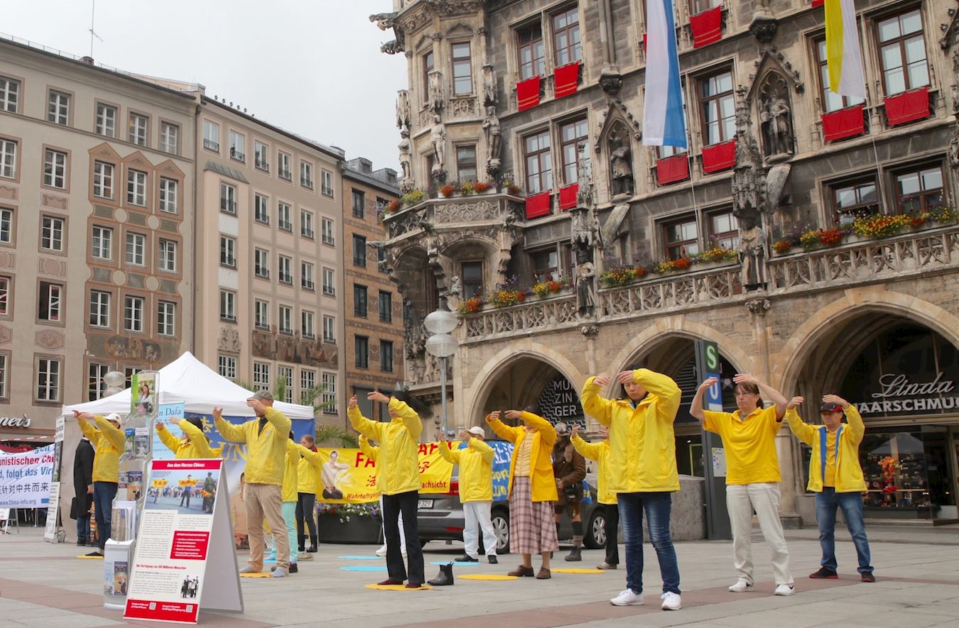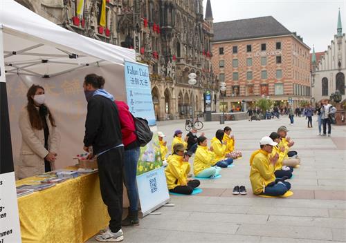 玛琳广场上,身穿黄色上衣的法轮功学员展示法轮功功法,悠扬的炼功音乐和有关功法的德国解说吸引着人们,一些人停下了匆匆的脚步,有人静静地观看学员炼功,有人观看讲述法轮功真相的展板,有的人索要资料,有的人到信息台签名声援法轮功学员反迫害。不少人签了名之后还在询问,自己能做些什么来帮助法轮功学员制止中共迫害。很多人表示不理解为什么中共要迫害修炼真、善、忍的人。