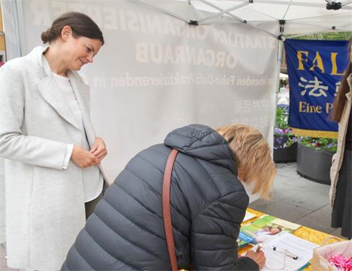 德国女士克里斯缇讷(Christine)签名制止中共迫害法轮功,她表示,“当人们对生活有良好的态度时,我不希望仅仅因为他们的信仰就遭受迫害和折磨,大家知道在那个国家(中国)还有很多鲜为人知的迫害。因此我签名了。”