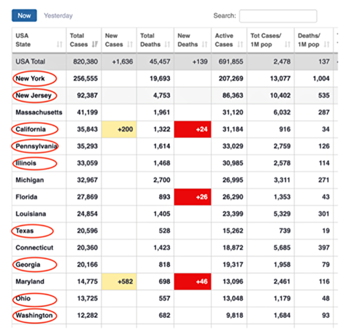 设立在美国的全球统计网站Worldometer.com对美国50个州按照中共病毒感染人数进行了排序。纽约州、加州、新泽西等都是重灾区。