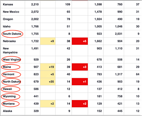 表三:截至2020年4月22日,Worldometer.com网站上美国染疫程度排名最后的15个州中有8个(红圈)是对华贸易排最后10位的州。