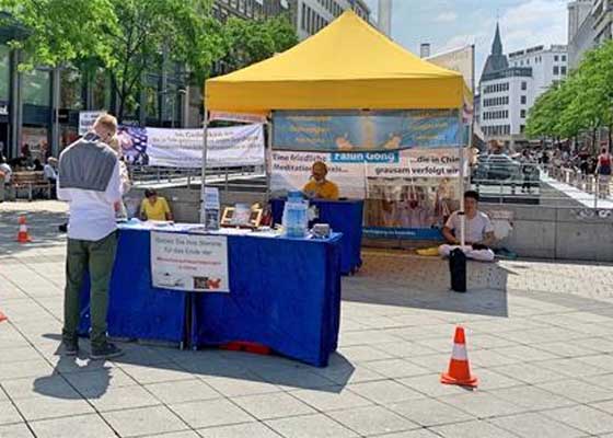 六月十三日,德国汉诺威学员在主火车站对面的邦厚夫街举办信息日,过往民众在信息展位前了解真相,并在制止活摘器官的请愿书上签名。