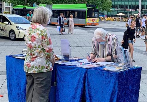 一为退休前曾为护士的女士来到展位前、在征签板上签名。她表示看到发生这样的事情(中共活摘法轮功学员器官)让她感到很难过。她之前也有听说过这场(在中国发生的对法轮功学员的)迫害,她阅读过许多相关的内容。她说:“这是在犯罪,这违反了人权。”她希望这场迫害可以尽快结束。离开之前她对学员说:“我祝愿您一切都好。”