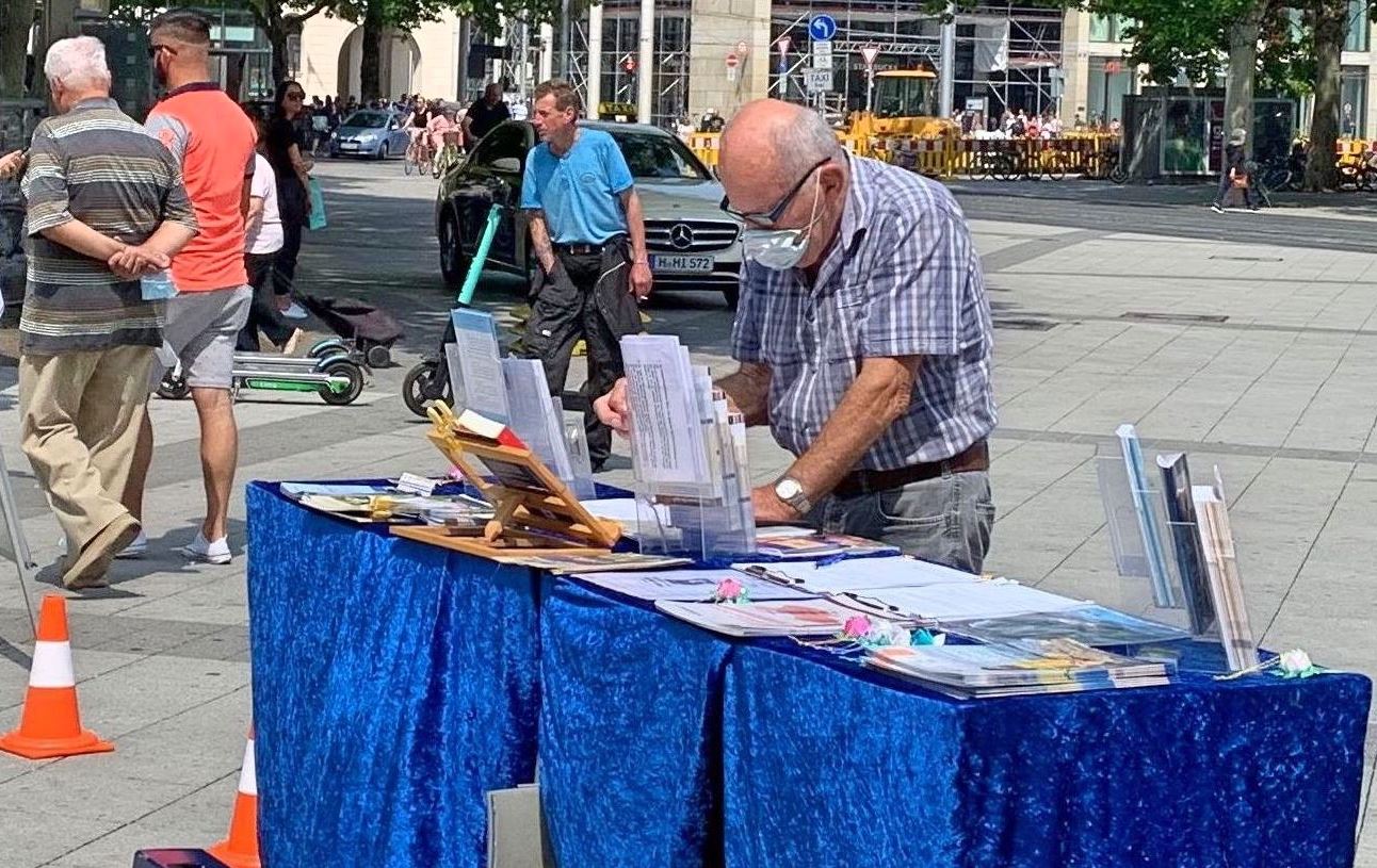 ![]() 图1~4:二零二零年六月十三日,德国汉诺威学员举办信息日,过往民众在信息展位前了解真相,并在制止活摘器官的请愿书上签名。 |