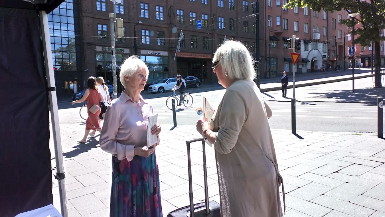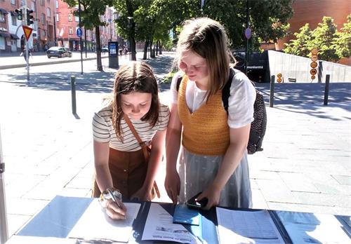 一位学员用英语把法轮大法的真相告诉正在读高三的欧娜(Oona),欧娜然后用芬兰语给身旁的朋友阿达(Aada) 解释整个过程。欧娜然后询问有没有网络征签,她想呼吁更多的朋友去关注法轮功的事情。她还说她有上一些文化课上,可以(把法轮功)介绍给同学。