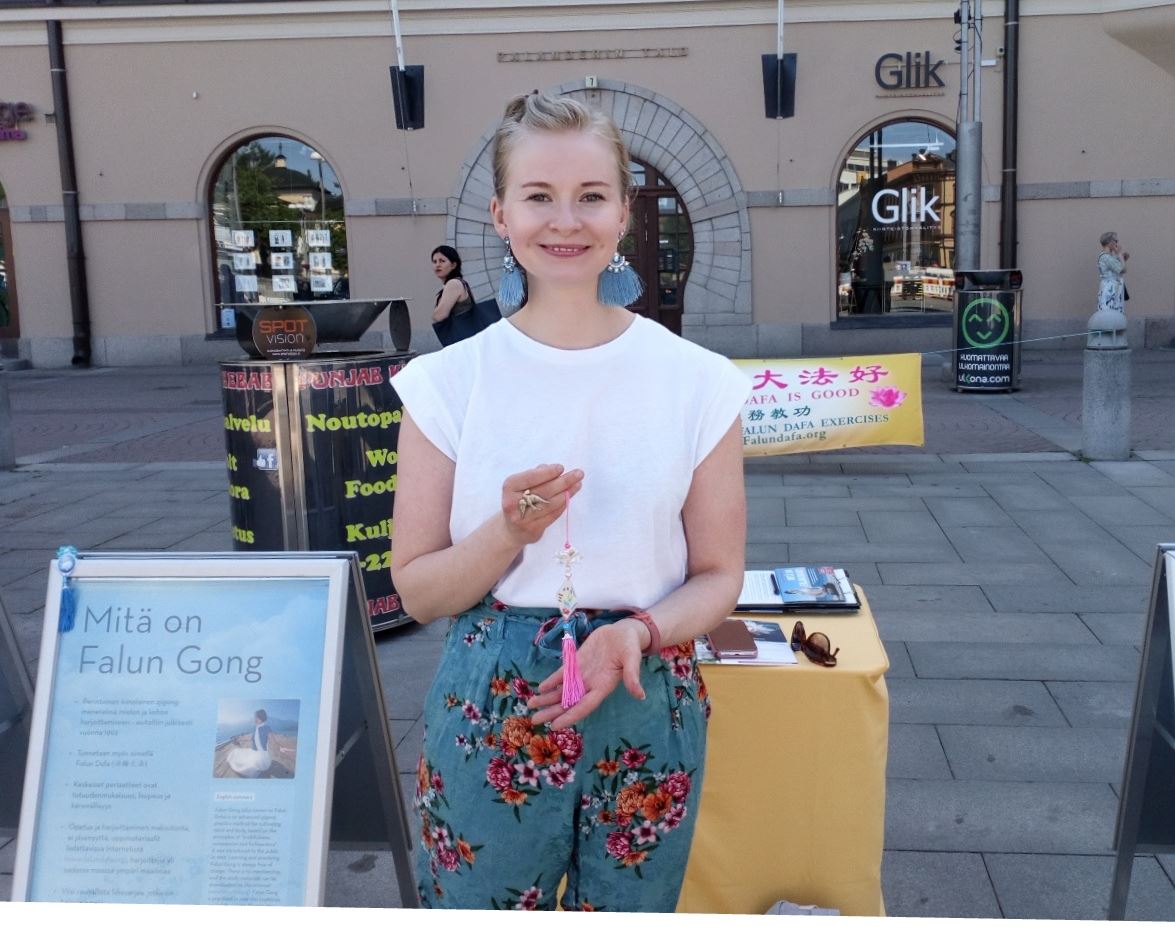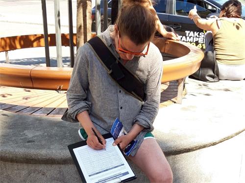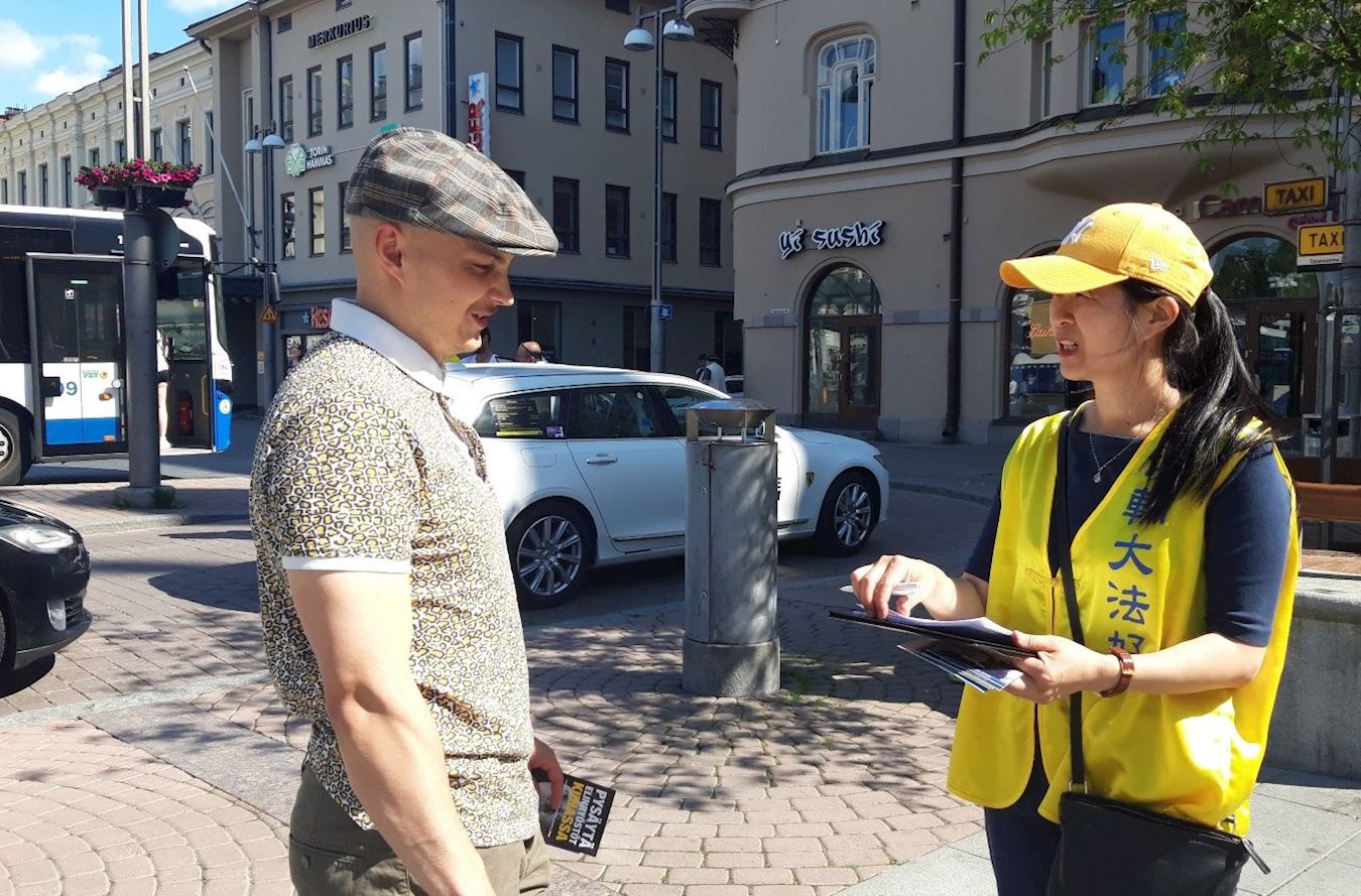 卡罗利纳(Karoliina)跟男朋友路过广场时,跟学员聊了起来。她的男友说自己的朋友去过中国,亲身感受到中国人的言论不自由。朋友也提过法轮功被残酷迫害的事实,在中国,人们不能在公开场合提到法轮功。