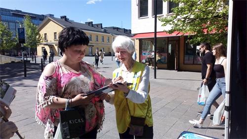 皮亚(Pia)是一位大学生,曾在学校里研究过中国文化和中国政治方面的课题。她知道中国的人权问题非常严重。她签完字后就解释给一旁的英国朋友。他们和法轮功学员还谈到中共在芬兰社会对文化、教育、科技等领域渗透的问题。