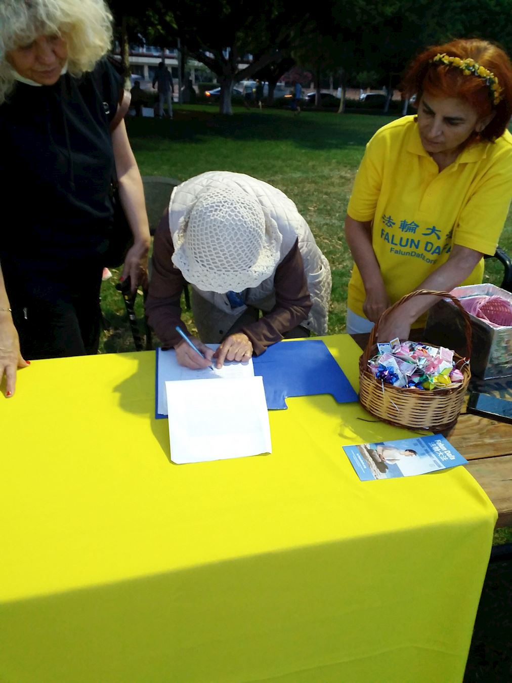 穆塞拉女士(Mücella)不是法轮功学员,但长期以来她一直热爱法轮功,她和八十三岁的母亲也来到法轮功的展位,支持法轮功学员的活动。穆塞拉女士和她母亲还在要求结束迫害的请愿书上签了名。