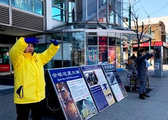 - 多伦多真相点遇见有缘人(图)- 多伦多法轮功学员在市区的唐人街和士嘉堡区的太古广场,摆放了真相展板、标语,以及“三退”平台,向过往民众讲述真相。